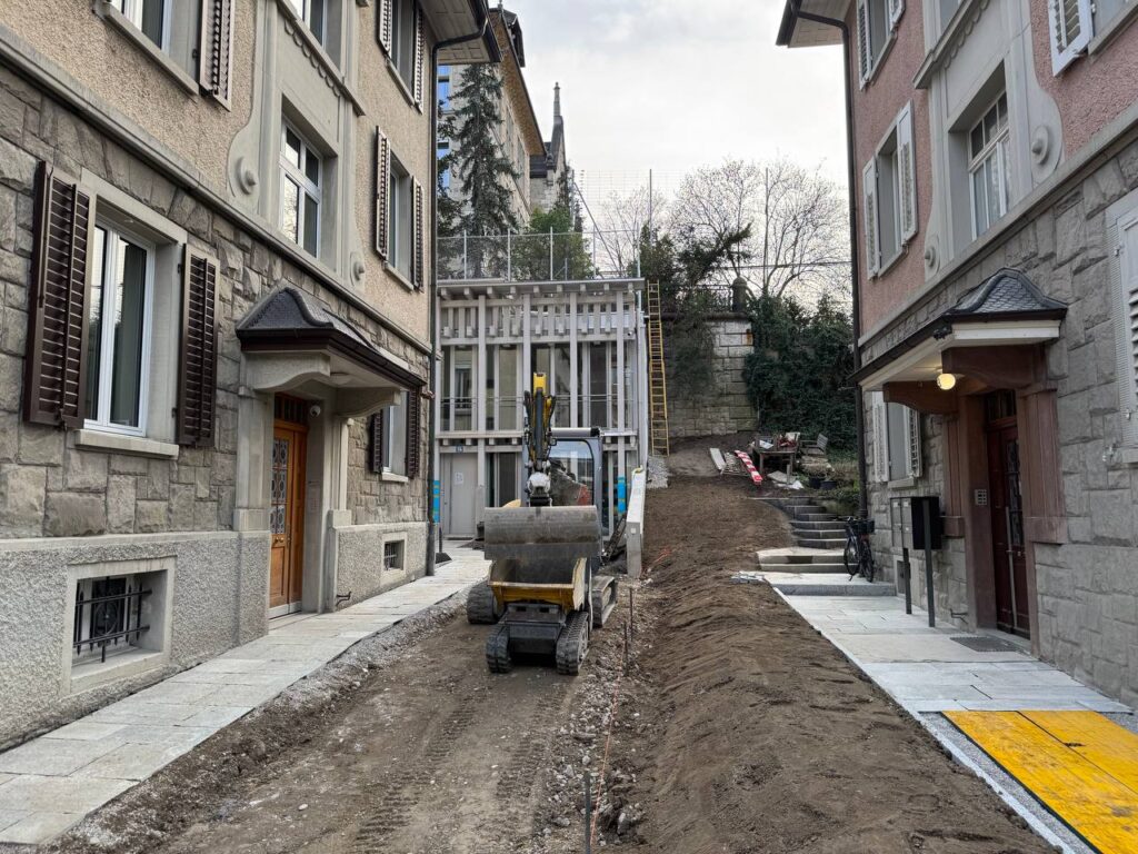 Nach der Baustelle ist vor der Baustelle! Nächste Woche fangen die Umgebungsarbeiten an. Zuerst wird neben der Hausmauer vom alten Haus gegraben, um das Feuchtigkeitsproblem im Keller zu untersuchen und hoffentlich sofort zu lösen. Danach kommen Abschlussarbeiten im Bodenbereich entlang der Fassade des neuen Hauses und das Ersetzen des Sichtschutzzauns zu Haus 15/15a. Nachher wird von “hinten” bei Schrennengasse 17/17a und 19 nach “vorne” (Strasse) gebaut. Die Bepflanzung folgt im neuen Jahr je nach Saison.
